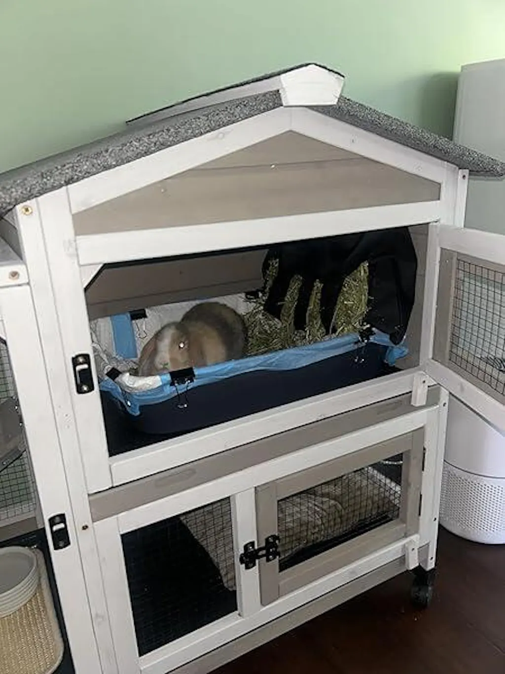 PETSCOSSET Rabbit Hutch, Indoor Two-Story Rabbit Cage with Pull Out Tray, Wheels, Asphalt Roof,White/Grey