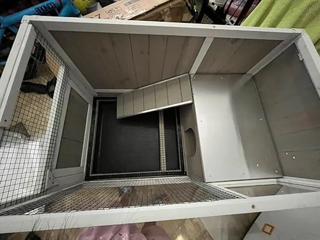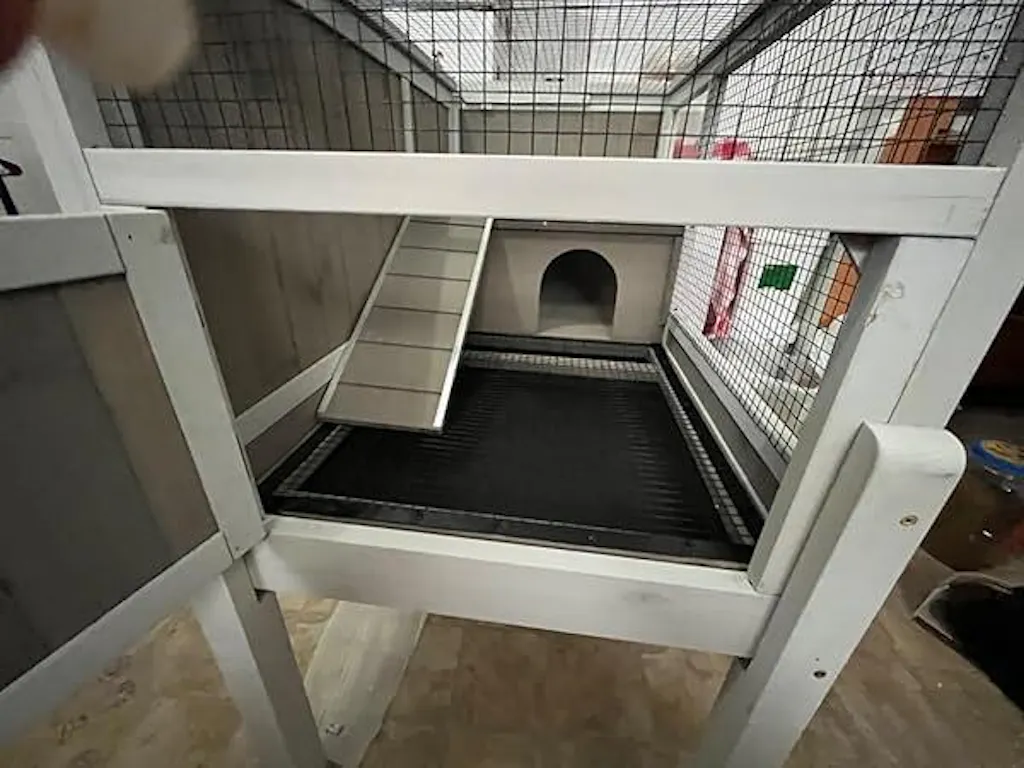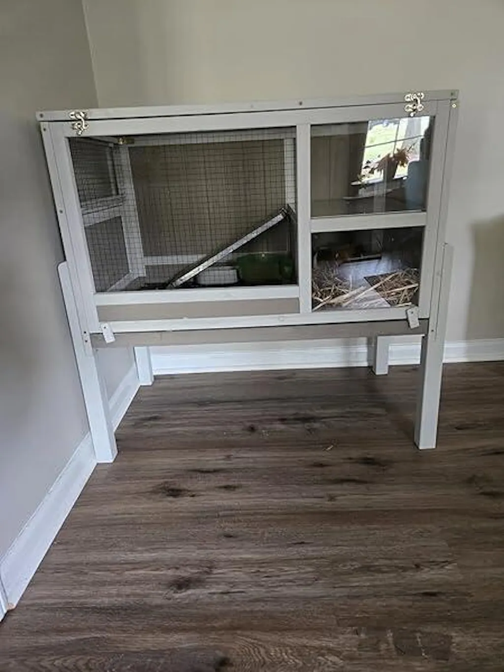 - Two-story design includes a private hideaway room, climbing ramp, and sunbathing platform for enrichment and exercise.