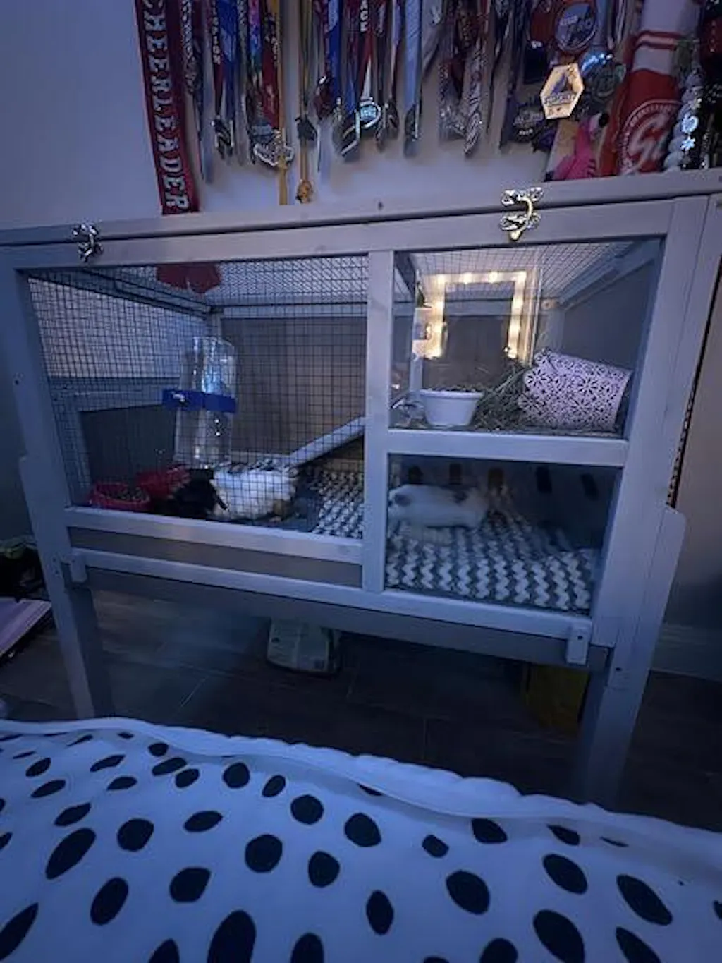 2-story cage lets popcorn-jumping guinea pigs zoom upstairs while kids giggle at dinnertime veggie raids